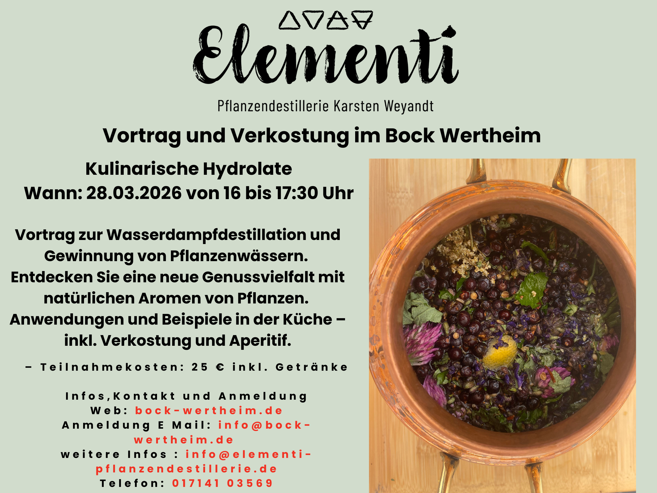 Vortrag und Tasting zum Thema „Kulinarische Hydrolate“ im Bock Wertheim.